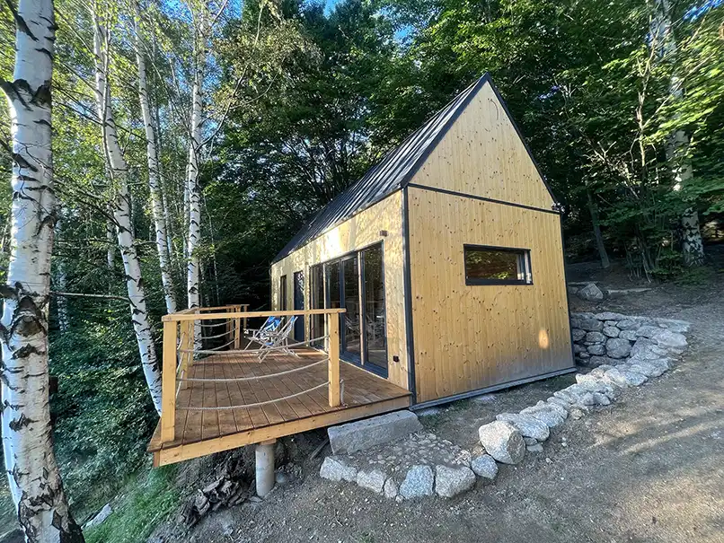 Chatka pomieści 5 osób. Na piętrze są dwa łóżka i rozkładana mini-sofa, a na antresoli – podwójne spanie. Nie wychodząc z łóżka, można rokoszować się widokiem, bo cała frontowa ściana domku jest przeszklona.